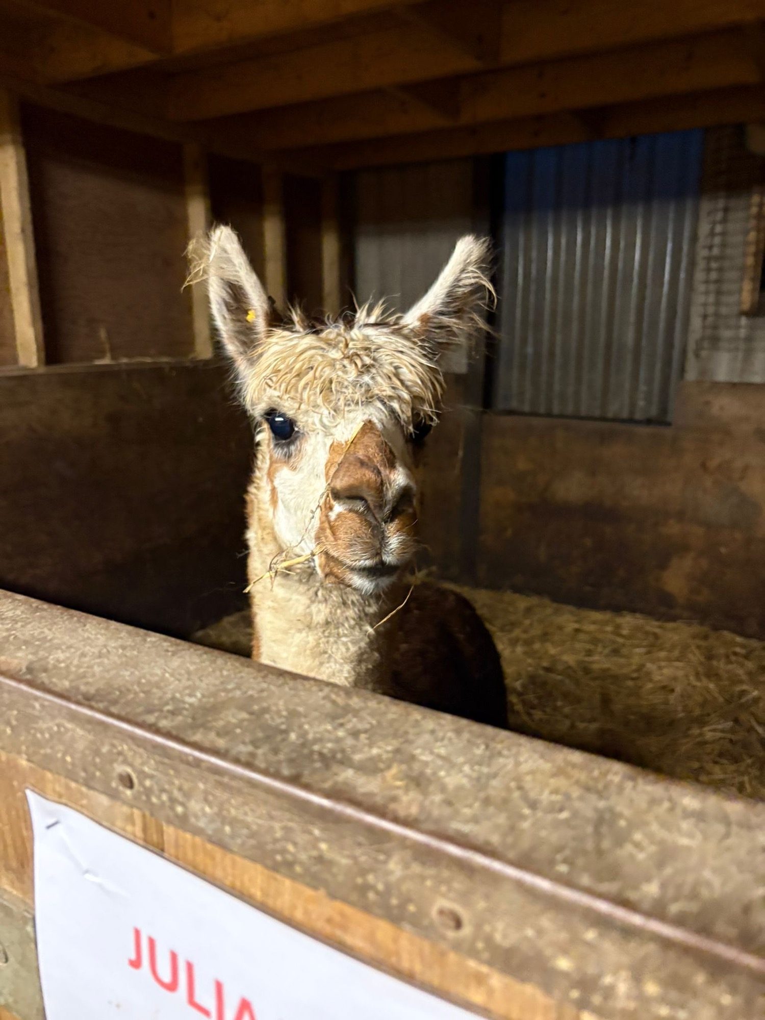 Alfie was not suitable for trekking due to his unfriendly manners towards people and other alpacas!We were happy to offer him a forever home. We have had him castrated and hope he calms down so he can live happily with his own kind. If not he is enjoying the elderly sheep...